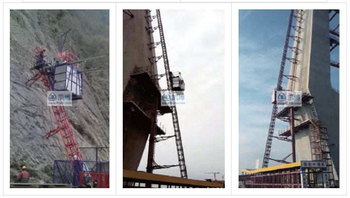 廣泛應(yīng)用于煙囪、水塔、橋梁等建筑工程,升降機(jī)軌道采用特殊處理,可曲、斜線布置,采用浮動調(diào)平機(jī)構(gòu)保證施工升降機(jī)沿曲線/斜線運動時吊籠始終保持水平。