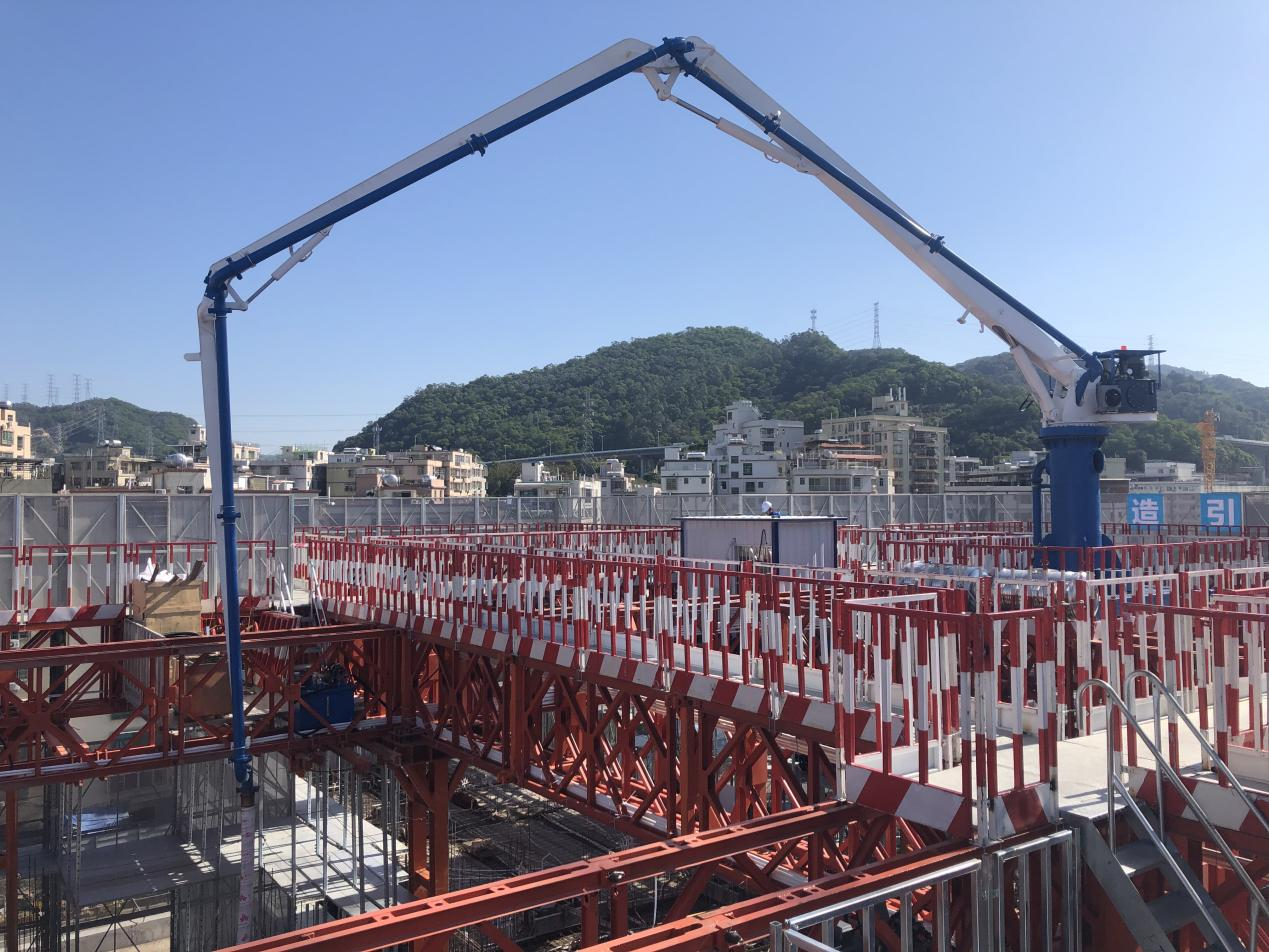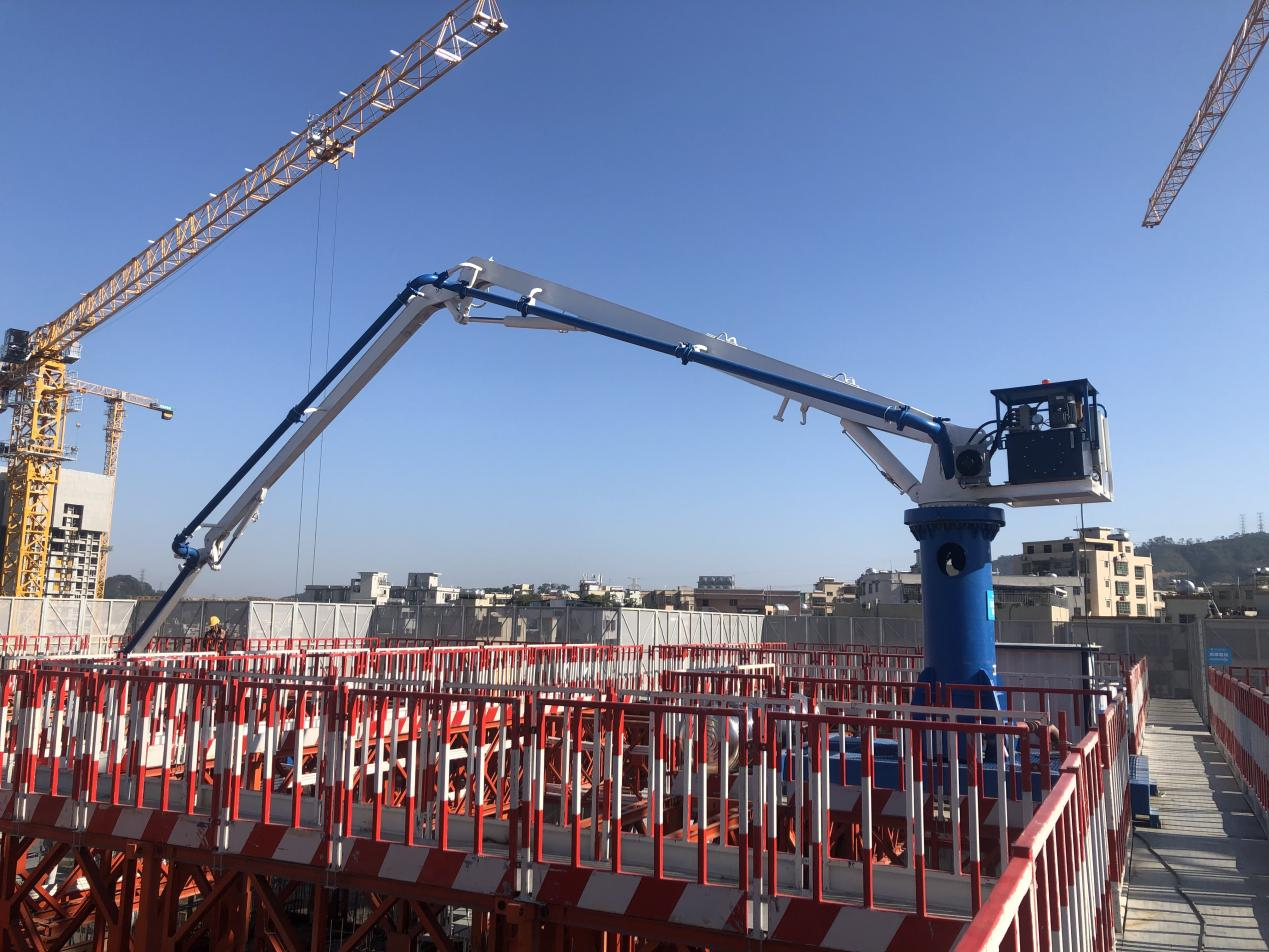 模架式液壓混凝土布料機自帶鋼平臺底座,與爬模架體連接傳遞施工載荷,無需自帶動力系統(tǒng),爬模爬升時帶動其爬升。其中HGY21模架式液壓混凝土布料機于2021年11月成功應用在使用“住宅造樓機”的裝配式建筑領域(中建三局承建的廣州大源村項目)。