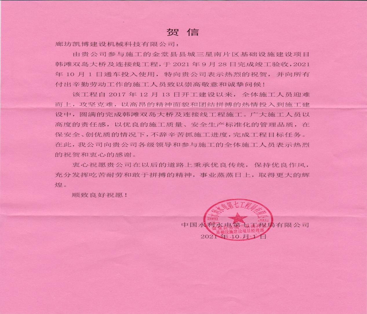 中國水電七局邀請我公司參加了金堂大橋的通車儀式、贈送紀念品,并專門發來賀信,對我公司在項目合作中的支持配合與辛勤付出表示衷心感謝。